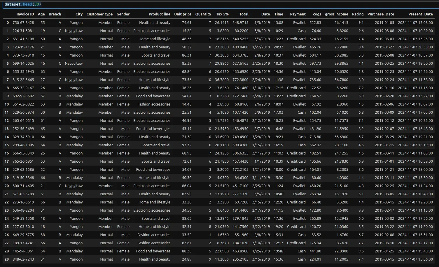 This dataset consists of unique Invoice IDs related to each purchase, along with Customer details against it such as Age, Gender, Store Branch, City, Product Line etc.