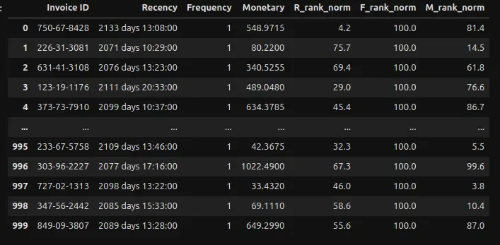 - Ranking all customers based on the Recency, Frequency, Monetary values and normalizing the values.