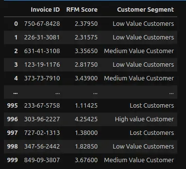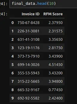 final_data = merged_data[['Invoice ID', 'RFM Score', 'Purchase_Date', 'Monetary', 'Rating', 'Customer type']]