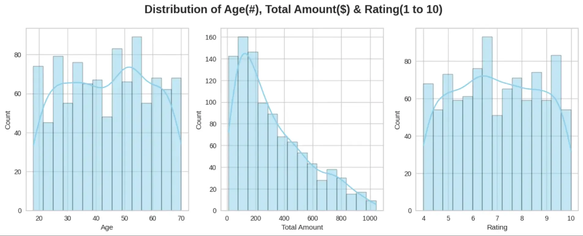 - Checking distribution of data using Histograms- across Age, Total Amount spent on products and Customer Ratings.