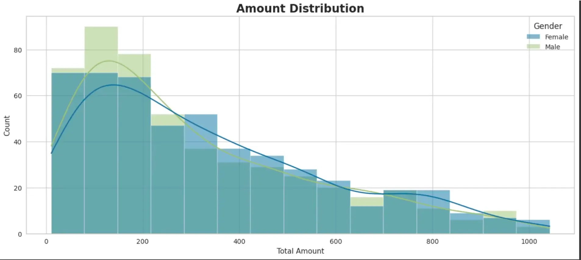 - Bar Chart to see distribution of amount spent - 90% of Customers spent in the range of 10 USD- 500 USD on products. With mostly Males spending on cheaper products <$200 and Females spending on expensive products >700 USD.