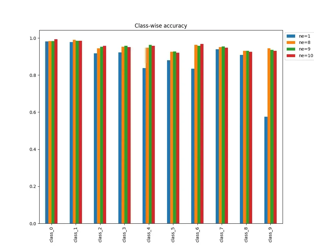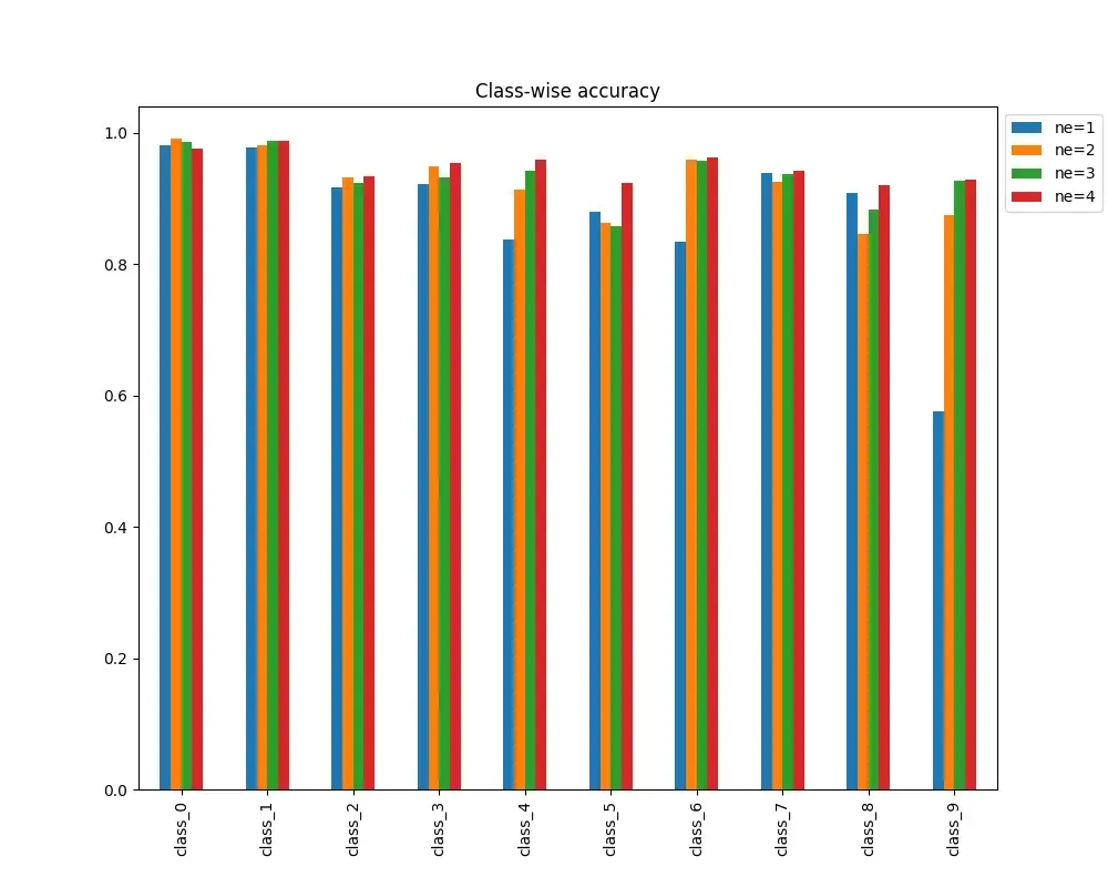 Let’s take a look at the classwise accuracy for different number of experts and compare to base model (with ne=1).