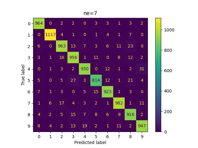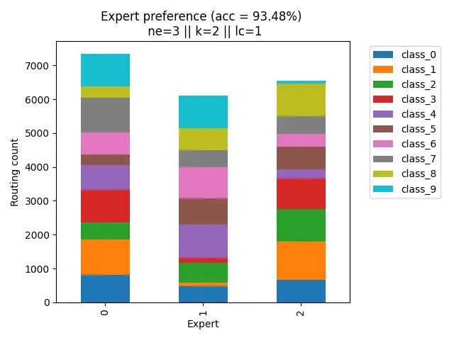Now we see specializations starting to occur. Most samples from each class are now being divided between 2-3 experts. This is also likely why we see a prominent jump in performance from ne=3 ($\approx$ 93.5%) to ne=4 ($\approx$ 95%)!