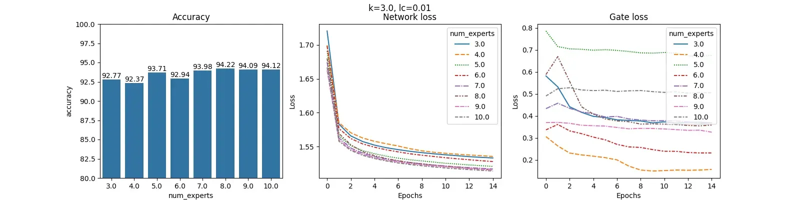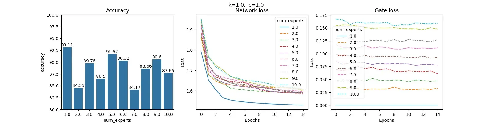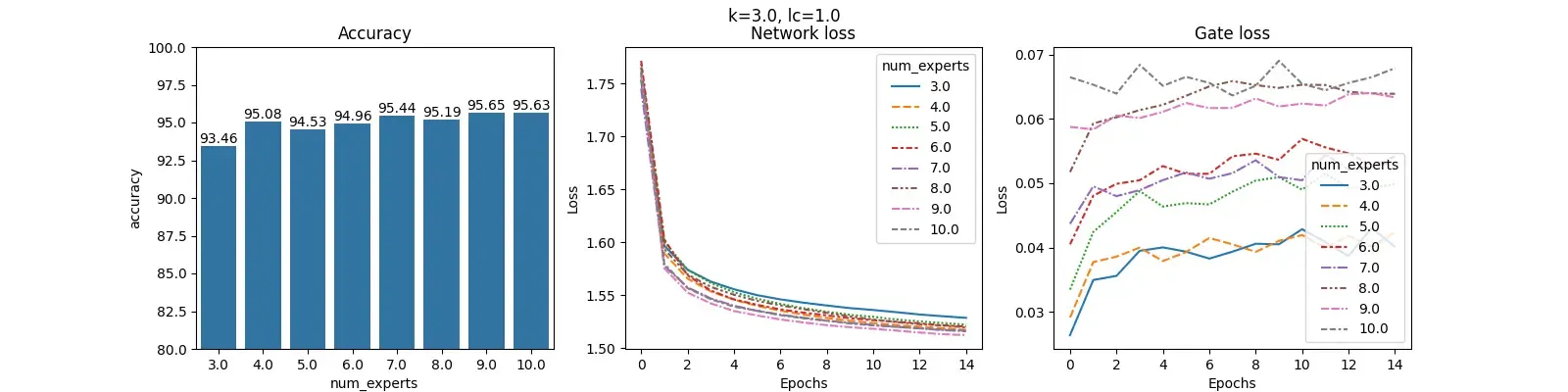 For each value of $lc$ and fixed $k$, we construct 3 plots: Accuracy, Network loss and Gate loss. The plot for Accuracy shows the overall accuracy of the MOE on the test set for different number of experts. The plot for Network loss shows the changing values of the Network loss during training. Similarly, plot for Gate loss shows the changing values of Gate loss during training.