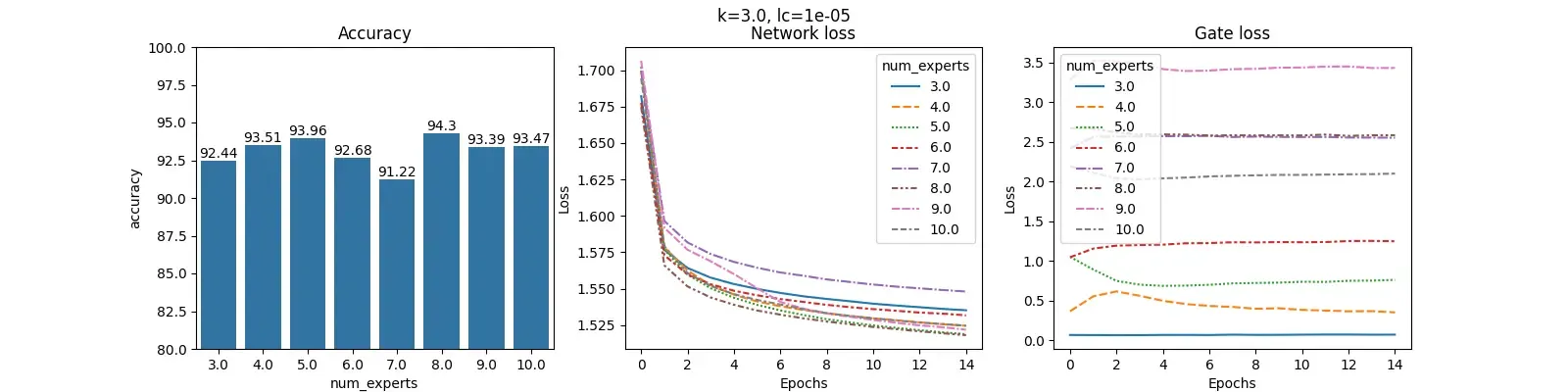 First, let’s fix $k$ and see the effect of $lc$ on the results for different number of experts ($num_experts$). The value of $k=3$ is fixed to understand the effect of $lc$ without a changing value of $k$. The number of experts is varied from $k$ to 10.