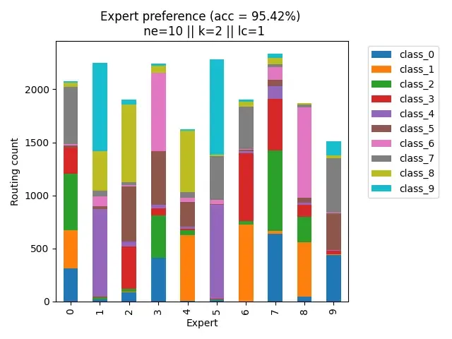 Model: The network itself consists of 2 parts: the router or gate, and the experts. The router is a linear layer with no bias and outputs a probability distribution over the experts. Each expert is a neural network with 2 layers: 784 —> 10 —> num_classes.
